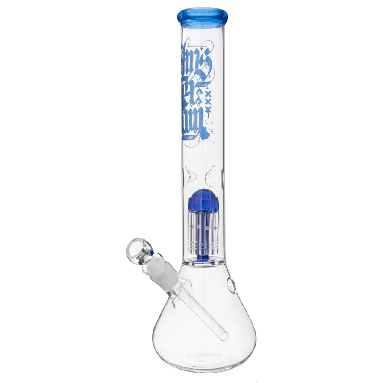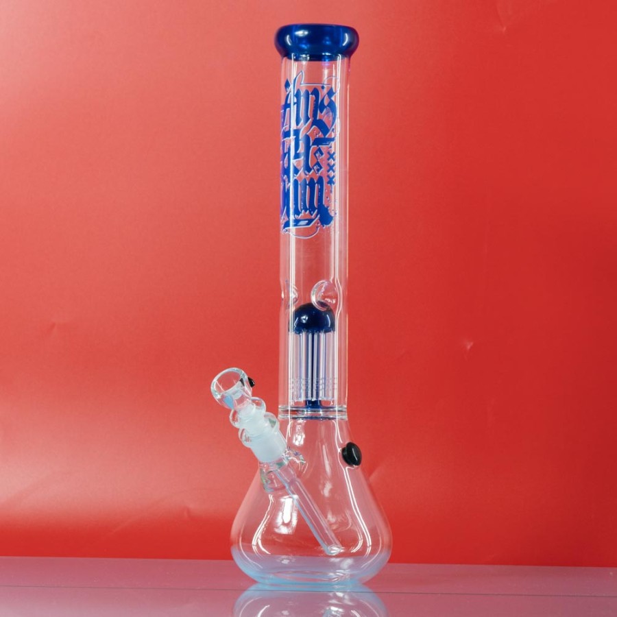 Высокий бонг Amsterdam - 8Tree Blue выполнен из боросиликатного стекла с толщиной стенки 3 миллиметра. Девайс имеет корпус с синим принтом, а камера 8-ми рукавного перколятора прозрачная. Благодаря этому очистка хорошо видна и за ней можно наблюдать прямо в процессе курения.