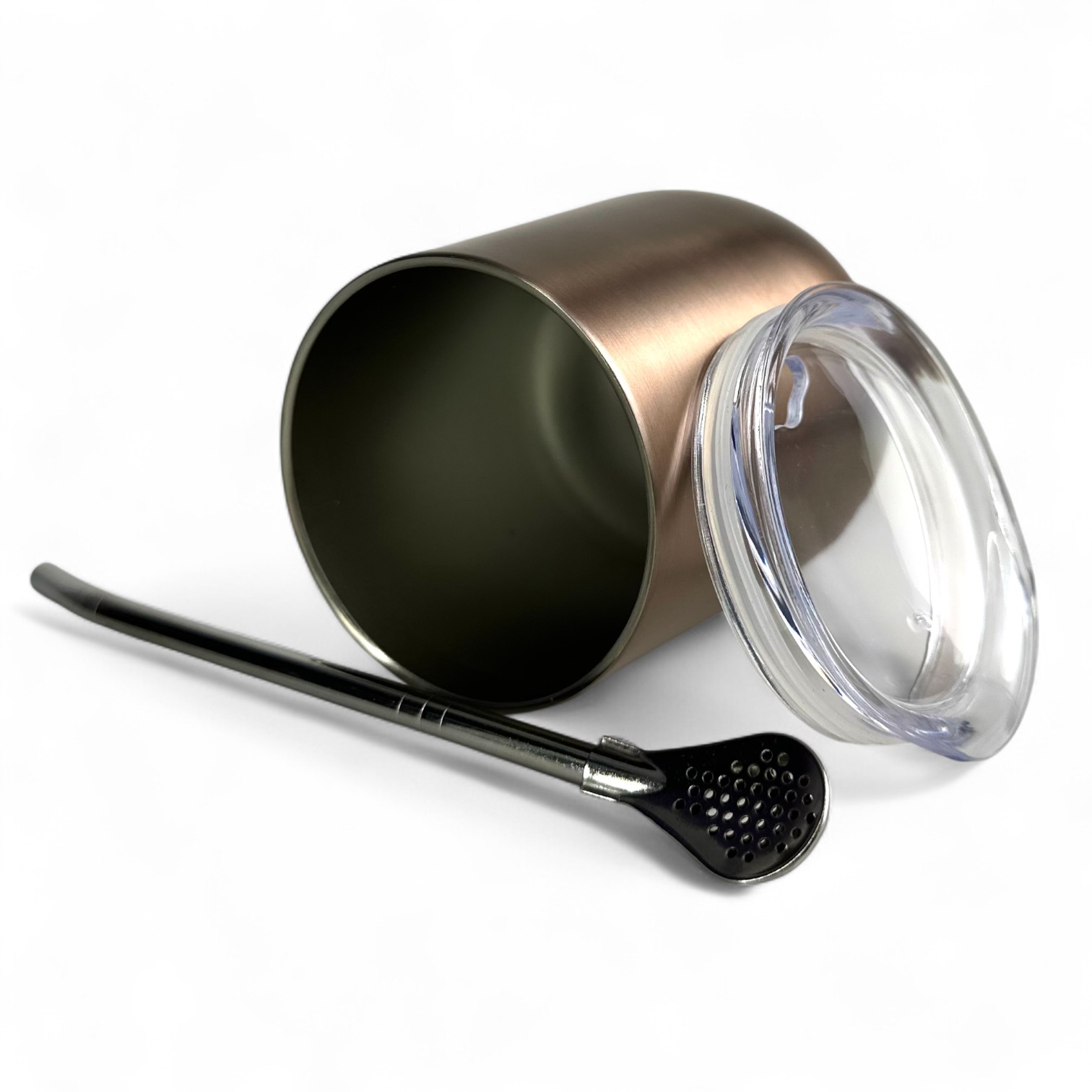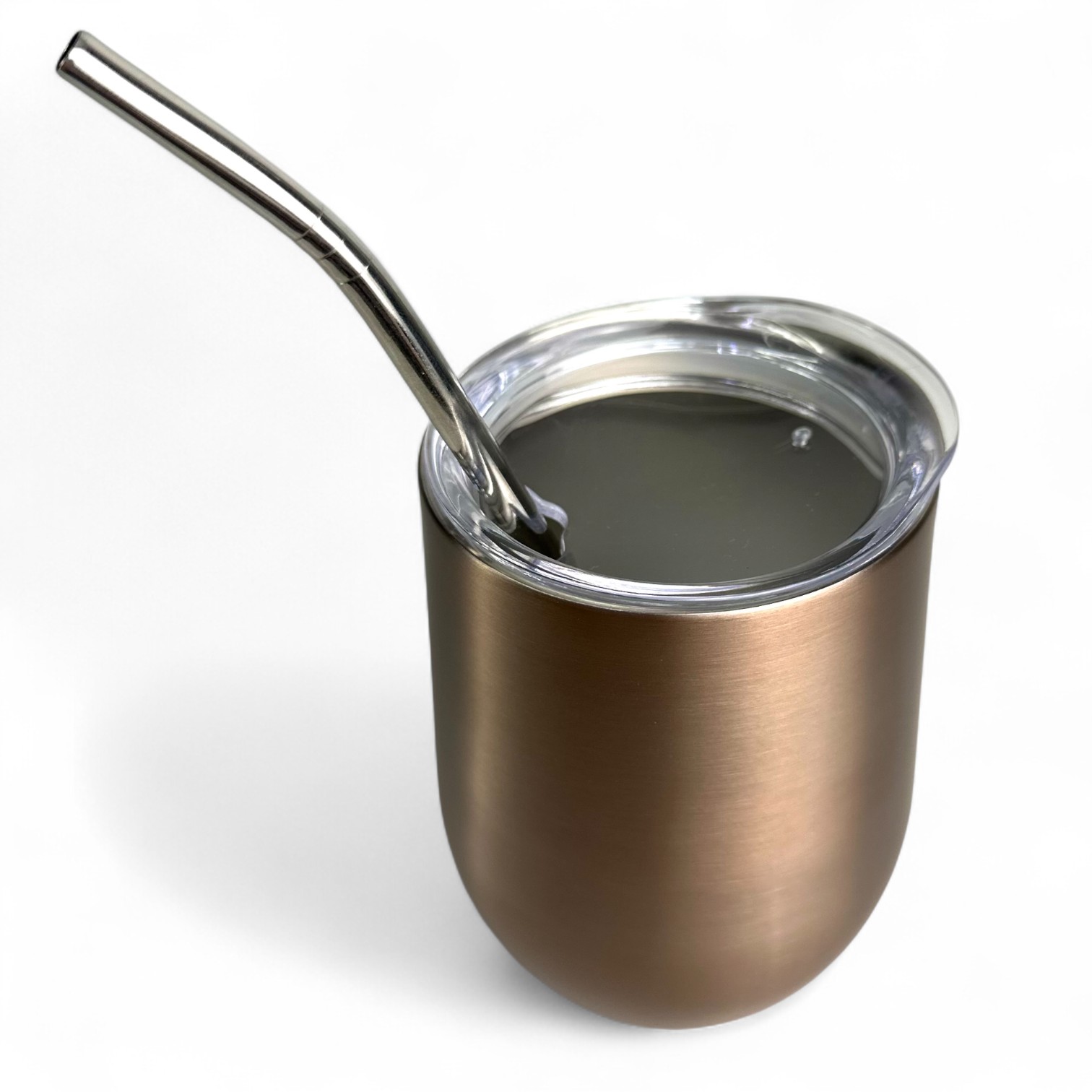 Этот стильный калебас выполнен из прочной нержавеющей стали с матовым бронзовым покрытием, придающим ему элегантный современный вид. Эргономичная форма удобно ложится в руку, а двойные стенки обеспечивают отличную термоизоляцию, сохраняя напиток горячим или холодным в течение длительного времени. Прозрачная крышка защищает от проливания, а многоразовая металлическая бомбилья с тонкой фильтрацией делает процесс питья комфортным и эстетичным.