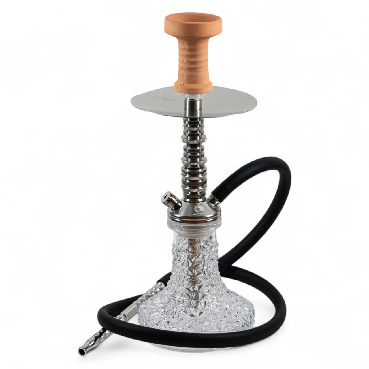 Кальян выполнен в современном стиле с плавными линиями и продуманной конструкцией. Оснащён устойчивой колбой, удобным мундштуком и гибким шлангом, что обеспечивает комфортное использование. Верхняя часть включает классическую чашу и металлическую тарелку для углей. В комплект также входят щипцы для удобной работы с углями. Подходит как для домашнего использования, так и для уютных встреч в компании.